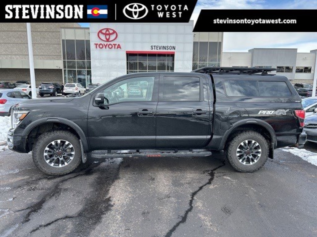 Super Black 2023 Nissan Titan PRO-4X 4WD 9-Speed Automatic 5.6L V8 DOHC 32V 400hp Stevinson Toyota West - STW is offering this 2023 Nissan Titan PRO-4X, in Super Black and Black Cloth, One Owner, Accident Free CarFax, Sunroof / Moonroof, Heated Seats, Rear Backup Camera, 4WD, 120V Outlet in Bed, 4-Way Power Assist Seat, Driver & Passenger Ventilated Front Seats, Dual Panel Panoramic Moonroof w/Tilt & Slide, Electronic Locking Tailgate, Fender Premium Audio System w/12 Speakers, Front & Rear Parking Sensors, Heated Driver & Passenger Seat, Heated Rear Seats, Heated Tilt/Telescoping Steering Wheel, Intelligent Around View Monitor (I-AVM), Leather Seat Trim, LED Tailgate Area Illumination, LED Under Rail Bed Lighting, Memory Driver Seat w/Auto Entry/Exit Feature, Off Road Protection Package, Power Folding Auto Dimming Outside Mirrors, Power Sliding Rear Window w/Defogger, PRO-4X Convenience Package, PRO-4X Moonroof Package, PRO-4X Utility Package, Proximity Activation, Puddle Lamps, Rear Utility Bed Step, Remote Engine Start on Key Fob, Side Turn Signal Lamps on Mirror Housing, Trailer Brake Controller, Trailer Light Check Function On Key Fob, Utilitrack System w/4 Tie-Down Cleats.