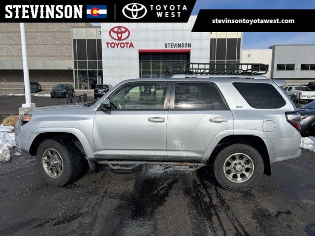 Classic Silver Metallic 2015 Toyota 4Runner SR5 4WD 5-Speed Automatic with Overdrive 4.0L V6 SMPI DOHC Stevinson Toyota West - STW is offering this 2015 Toyota 4Runner SR5, in Classic Silver Metallic and Black Leather, Accident Free CarFax, Rear Backup Camera, 4WD, Black w/Softex Synthetic Leather Seat Trim, 17 x 7.0 6-Spoke Alloy Wheels, ABS brakes, Alloy wheels, Electronic Stability Control, Heated door mirrors, Illuminated entry, Low tire pressure warning, Remote keyless entry, Traction control.