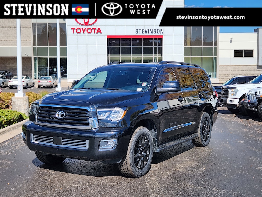 Midnight Black Metallic 2019 Toyota Sequoia TRD Sport 4WD 6-Speed Automatic Electronic i-Force 5.7L V8 DOHC VVT-i Stevinson Toyota West is offering this 2019 Toyota Sequoia TRD Sport, in Midnight Black Metallic and Black Leather, Sunroof / Moonroof, Heated Seats, Heated Steering Wheel, 6-Speed Automatic Electronic, 4WD, 2nd Row Captains Seats, ABS brakes, Active Cruise Control, Alloy wheels, Auto-Dimming Rear-View Mirror, Compass, Electronic Stability Control, Front dual zone A/C, Heated door mirrors, HomeLink Universal Transceiver, Illuminated entry, Leather Seat Trim, Low tire pressure warning, Power moonroof, Radio: Premium Display Audio w/Nav & Entune, Remote keyless entry, Traction control, TRD Shift Knob, TRD Sport Badge, TRD Sport Door Sill, TRD Sport Floor Mats, TRD Sport Grade Package, TRD Sport Premium Package, TRD Sport Shocks, TRD Sport Sway Bars, Wheels: 20 Aluminum.