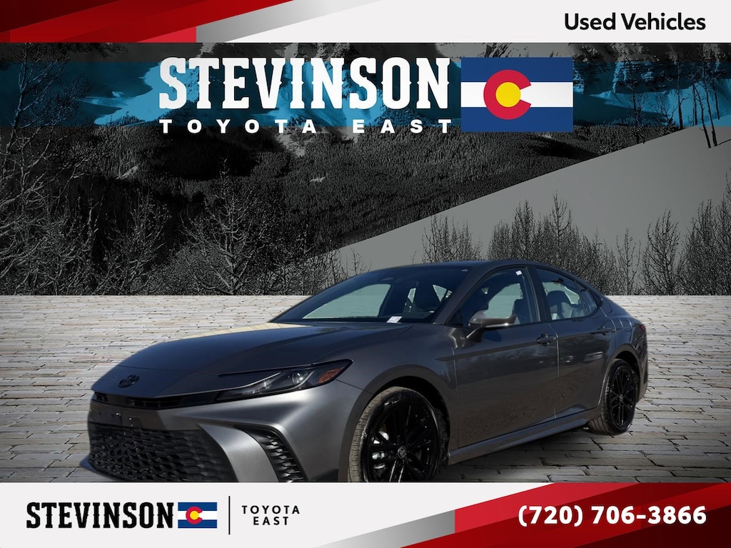 Stevinson Toyota East - STE is offering this 2025 Toyota Camry, SE, in Heavy Metal and Boulder Premium Synthetic, only 25337 miles, Rear Back-Up Camera, One Owner, Blue Tooth, Leather, Apple CarPlay, Android Auto, 2.5L 4-Cylinder 16V DOHC, Boulder Premium Synthetic.
